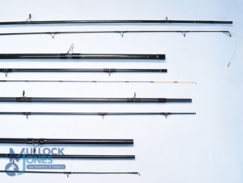 Avanti Argenta Power Cast Vitreous Interweave Crossfibre Rod 12ft 3pc 22" composite handle, uplocking reel seat, lined rings throughout, MCB, very light use; DAM Quicksilver match rod 13ft 3pc 23" composite handle with sliding reel fittings, stand off rings, butt ring missing lining, cloth bag; unnamed carbon float rod 11ft 3pc 24" cork/composite handle, Fuji uplocking reel seat, cloth bag; Jerry John's carbon swing tip rod 10ft 2pc 24" handle, sliding reel fittings, stand off rings, cloth bag. (4)