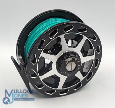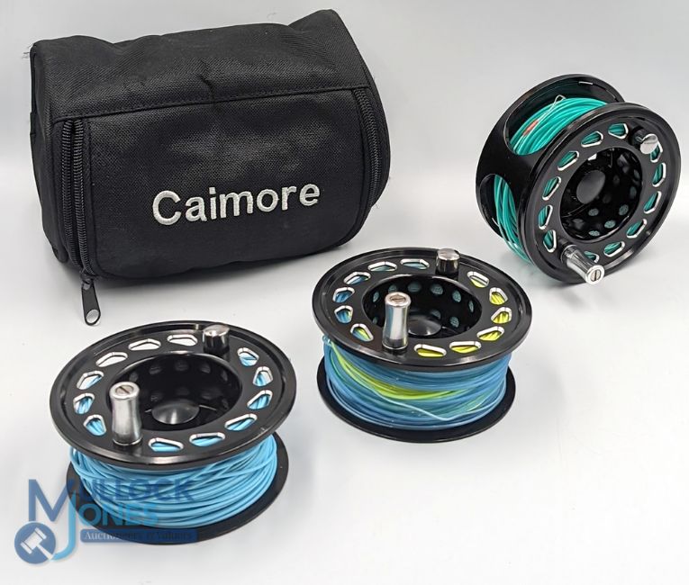 Airflo Xceed 10/12 alloy salmon fly reel with 2 spare spools, 4 1/4" wide ventilated spool with alloy counter balanced handle, large rear tensioner, constant check, in Caimore 3-section zip case
