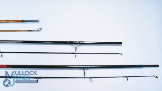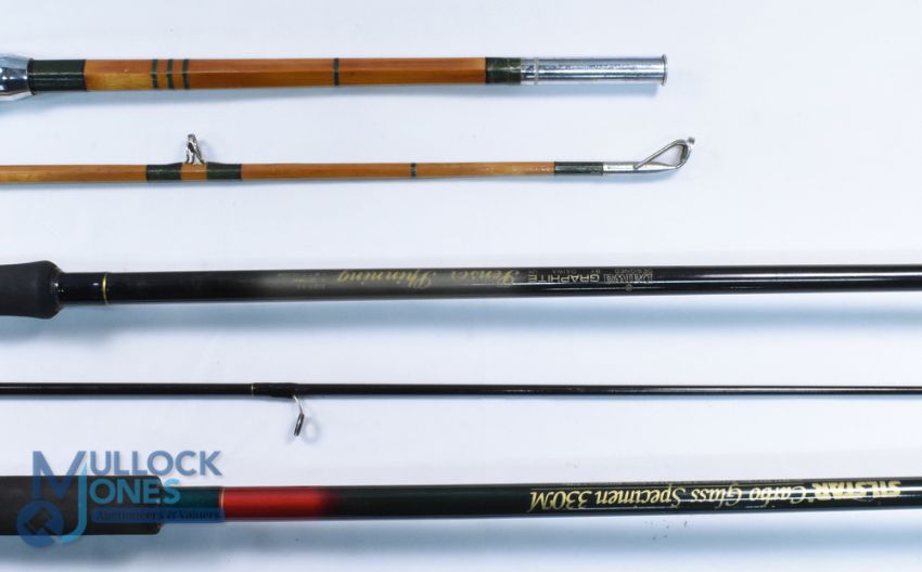 Daiwa Graphite Sensor spinning rod 9ft 2pc CW 7-35g, 26" composite handle, up locking reel seat, lined rings throughout, MCB; Silstar Carbo Glass Specimen rod 11ft 2pc 32" handle, up locking reel seat, lined rings, cloth bag tatty!! Unnamed split cane boat rod 6ft 2pc 23" wood handle, alloy uplocking reel seat, lined rings, no bag. (3)