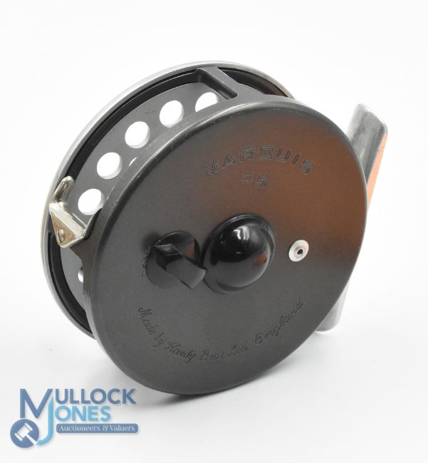 Hardy "Marquis 5" alloy trout fly reel 3" ventilated spool, 2 screw latch and black handle, rear tensioner, constant check, 'U' shaped line guide, MZC with instructions. Light use, runs very well
