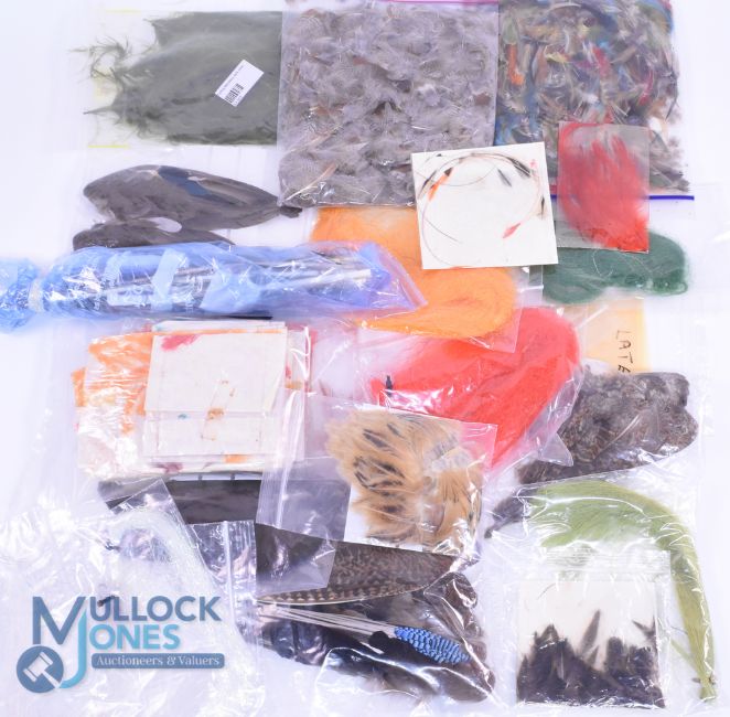 A collection of fly tying feathers comprising: Jay, pheasant, partridge, mallard, marabou, teal and a large selection of flank feathers. See photo