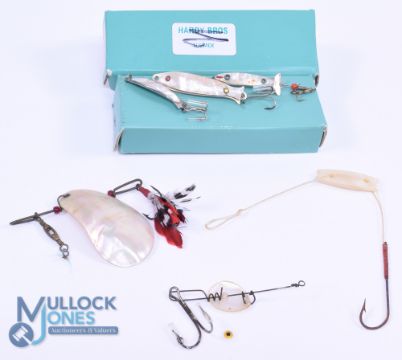 Collection of 6 Mother of Pearl spoons and spinners, sizes ranging 1"-3" blades, some on metal fish shape base mounts, one on a gut trace, good varied collection. (6)