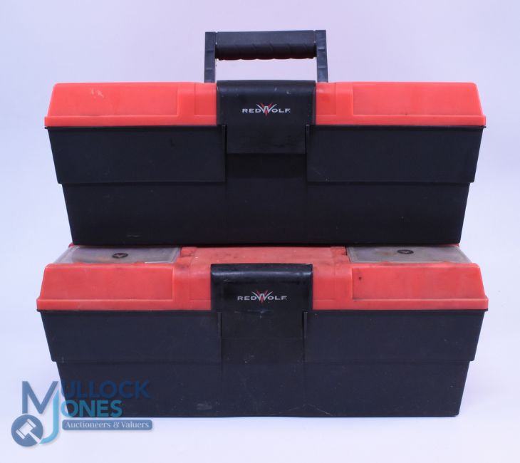 A pair of Red Wolf tackle boxes: 16" x 7.5" x 6.5" with 4 slide out sections to top and an internal lift out tray. Both with a large selection of terminal tackle, comprising hooks, weights, lures, shads unused and unused rigs