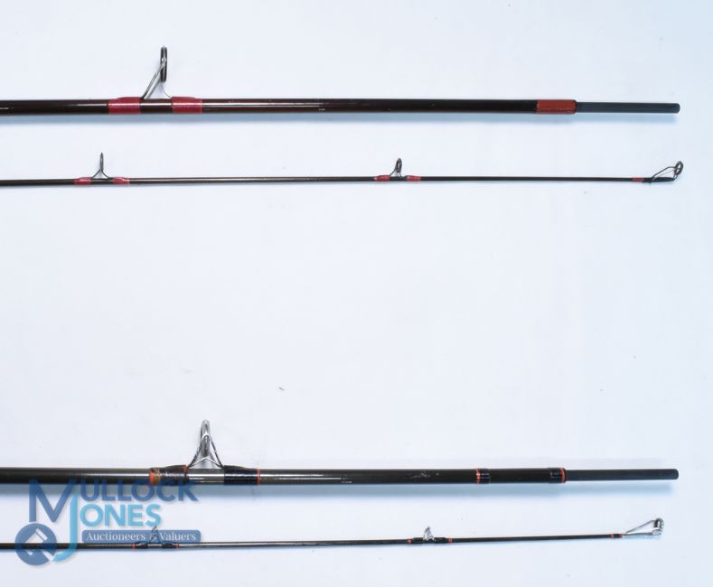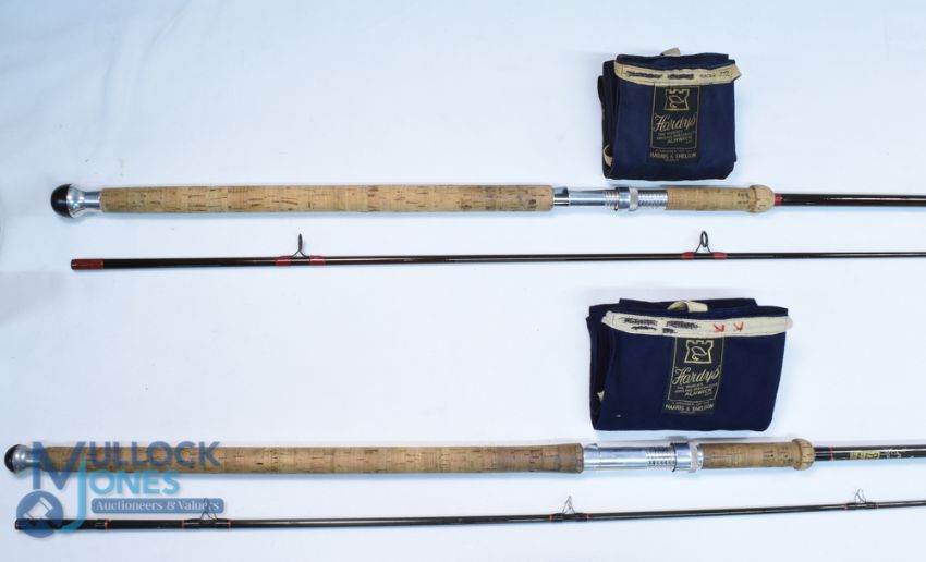 Hardy Alnwick "Graphite Spinning" No 2 salmon rod 10ft 2pc, 28" mushroom handle with alloy down locking reel seat, lined butt/tip rings, MCB. Plus - in the style of a Hardy Fibatube No 2 salmon spinning rod, 26" mushroom handle, alloy down locking reel seat, lined rings throughout, Hardy cloth bag. (2)