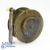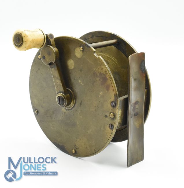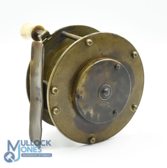 Early c1880 unnamed 3 3/4" all brass salmon winch fly reel style of Jones Maker London, with interesting folding handle fits recessed to rim with circular locking screw, raised gear housing to rear, pillared construction with 5x pin brass foot, constant check