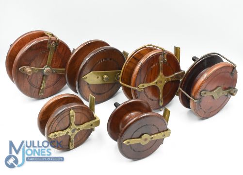 6x Various Nottingham wood and brass reels - sizes vary between 3 1/2" to 5" examples, 3x strapback examples and 3x star back examples, 1x features a rim brake, 2x with Bickerdyke line guards, 2x on/off check mechanisms, generally F/G examples