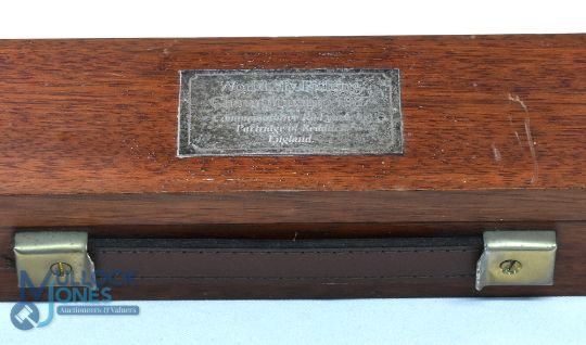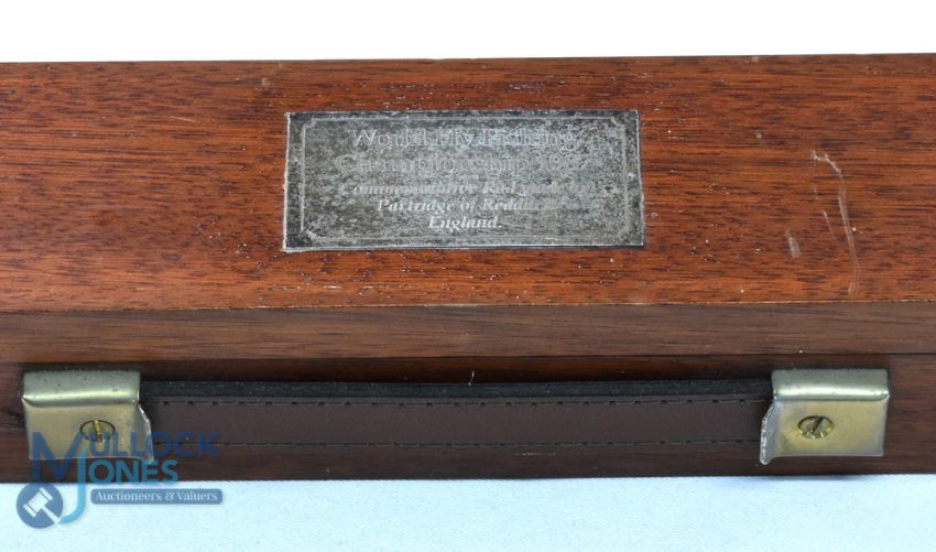 A fine and rare limited edition (2 of 20) Partridge of Redditch split cane fly rod, No 1, presented to 1987 World Champion - 8ft 2pc line 5#, with spare tip, brass reel fittings and collars with wood insert reel seat, MCB and hard wood presentation box with a brass plaque. Light use