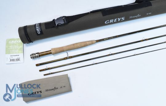 A fine Grey's Alnwick Stream Flex carbon trout fly rod 10ft 4pc line 5 alloy double uplocking reel seat with burr wood insert, lined stripping rings, MCB and Cordura tube (label still attached), very light use