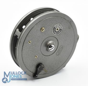 J W Young & Son Redditch "Rapidex" alloy centre pin/trotting reel, 4" narrow ventilated spool with 2 screw latch, milled face plate tensioner, twin handles, on/off check, in correct original box. Very light use, runs very well