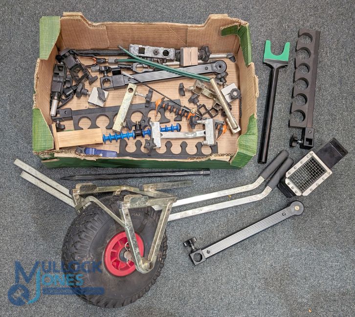 Fishing wheelbarrow wheel and other fishing box parts, rod rest spare parts, a good inflatable wheel 400-5, good lot of spare parts