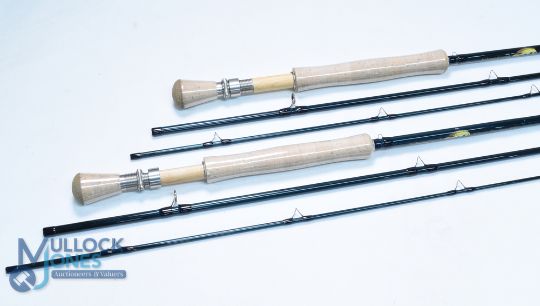 Silver Creek Silver Stream SW 9'6", 4 piece graphite travel rod, line #7/8, shrink wrap cork handle with wood reel seat, screw winch fitting, unused in bag and tube, plus a similar 10' 4-piece rod, in bag and tube, both appear unused. (2)