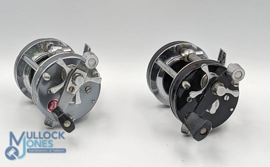 Abu Ambassadeur 6000C multiplier reel, 3 screw end plate, foot stamp 740202, chips to rims, and a Ambassadeur 6500C high speed multiplier, foot stamp 761004, star drag, level wind and ratchet, salt water corrosion to finish but working. (2)