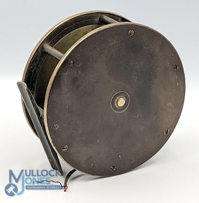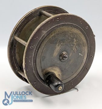 Bowness & Bowness Maker The Strand London, ebonite and brass 5" wide spool salmon reel, domed horn handle, brass rims, 7 pillar frame, brass foot (small loss to inner rim and small crack in face rim). Runs well