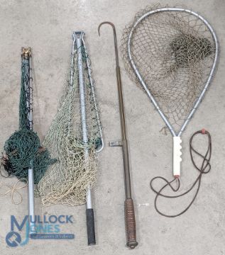 Folding Landing Nets, Scoop Net and a Brass Gaff, all unbranded - aluminium framed landing nets, an aluminium framed scoop net and a brass extendable gaff, square section, with a fine turned handle, but is missing its gaff safety hook clip from top