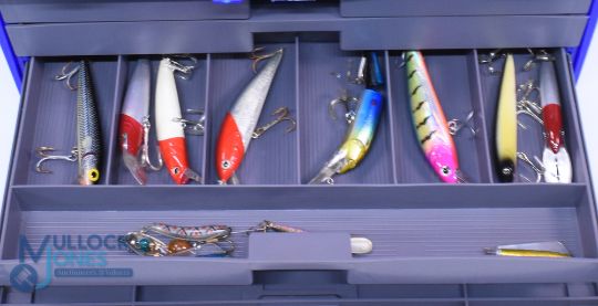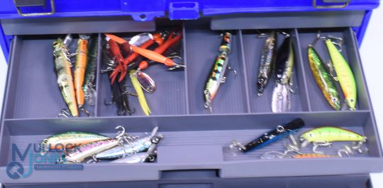 Large unnamed tackle box 17" x 10" x 12", large hinged top section, 4.5" deep with drop front to 4 slide out shelves containing a collection of terminal tackle, as listed. Top box of over 40 unused shads, a rig wallet with 10 leaves with a large selection of pre-made rigs in various sizes. Drawer 1 with hooks, swivels, shrimp rigs and swivels. Drawer 2 - 15 lures, some Abu and Flying C's. Drawer 3 - 13 lures. Drawer 4 - 14 lures.
