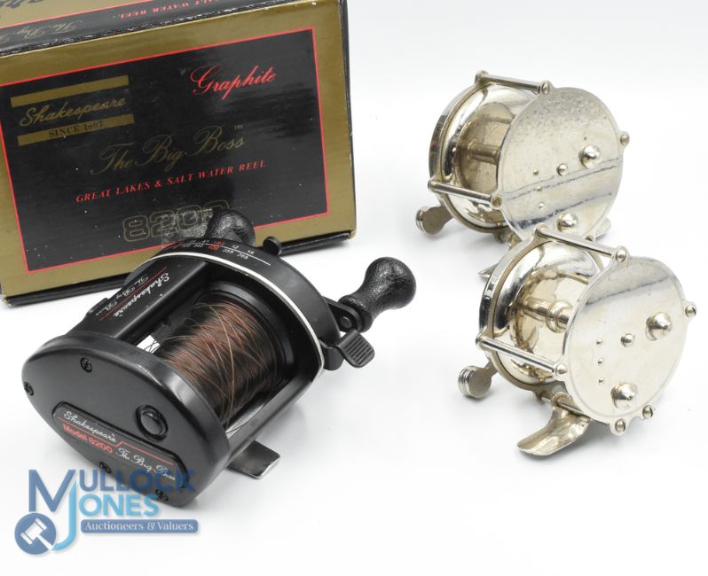 Shakespeare "The Big Boss" model 8200 multiplier, twin handles, on/off check, star tensioner, original box, tool and instructions, light use, runs well; Atlas Portage multiplier size 100 stamped on foot, straight counter balanced white handle, on/off check and sliding tensioner, light use, runs very well; another as above but stamped 80. (3)