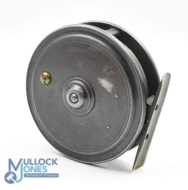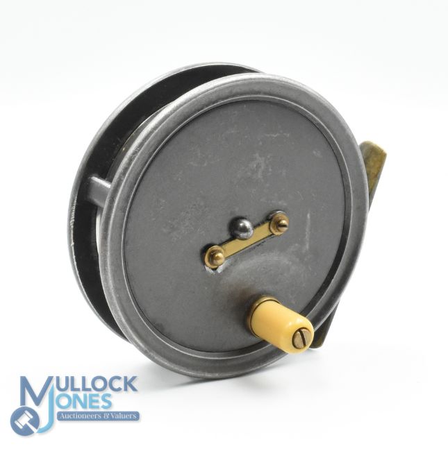 J J S Walker Bampton Alnwick 3 1/2" alloy trout fly reel stamped 1 internally, drop latch quick release spool, brass foot, constant check, light surface wear, o/w good overall