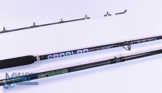 Abu Sweden, fine Conolon Pro carbon boat 7ft 9", reel line 15-20lb, 3pc (inc handle), composite grips with uplocking reel seat, lined rings throughout, MCB, very light use. Abu Sirus Uptider carbon sea rod 9ft 6" 2pc No 919444 F11, composite grips, uplocking reel seat, lined rings throughout, MCB, looks unused. (2)