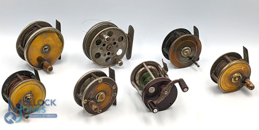 A collection of reels, as follows: 1x Invita 2 3/4" reel, twin handles, on/off check, runs ok; 1x Apollo multiplier, on/off check, twin handles, runs ok; 5x small brass display reels. (7)