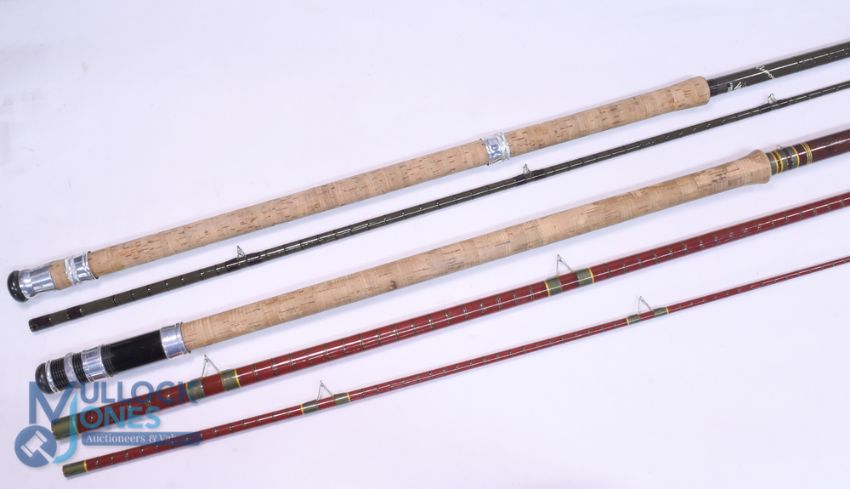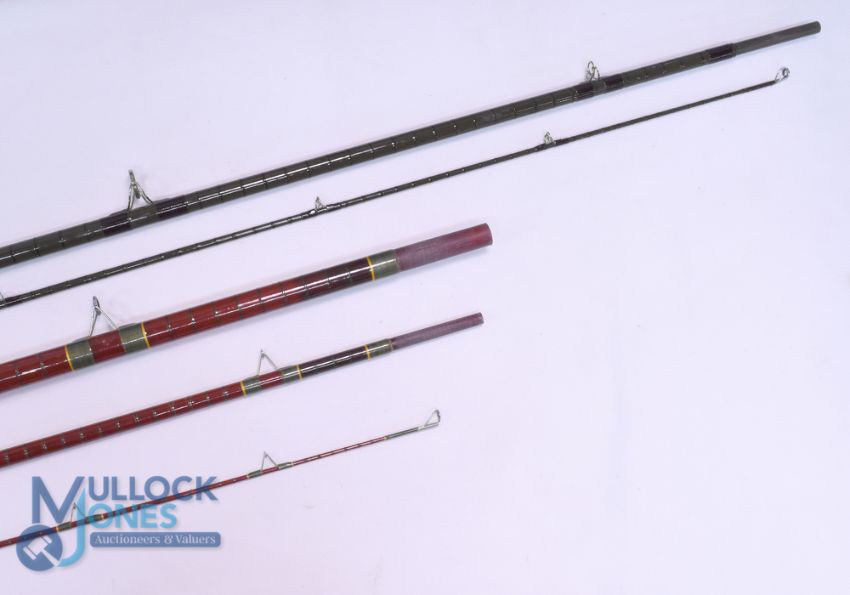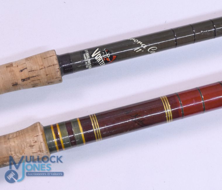 Olivers of Knebworth match fibre glass course rod 13ft 3pc 28" handle with alloy sliding reel fitting, stand off rings throughout with red agate butt/tip, cloth bag, light use. E T Barlow & Sons Thames Ditton "Vortex Aurola" carp hollow glass rod, 11ft 2pc, 27" handle with alloy sliding reel fittings, red agate butt/tip rings, cloth bag. Very light use. (2)