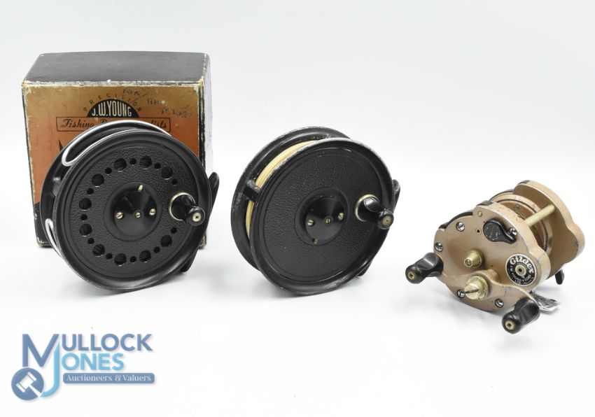 J W Young & Son Redditch "The Beaudex" alloy trout fly reel, 3 1/2" spool, 2 screw latch, twin handles, on/off check, in correct original box, very light use, dual alloy line guide; J W Young "Pridex" alloy trout fly reel, 3 1/2" spool, 2 screw latch, constant check, light use, runs well; JH W Young "Gildex" multiplier, serpentine twin handles, on/off check, tensioner, runs well. (3)