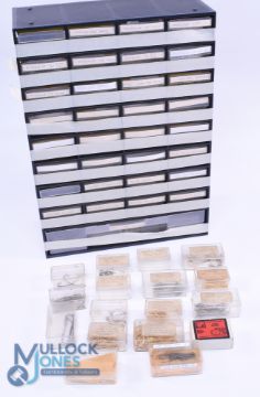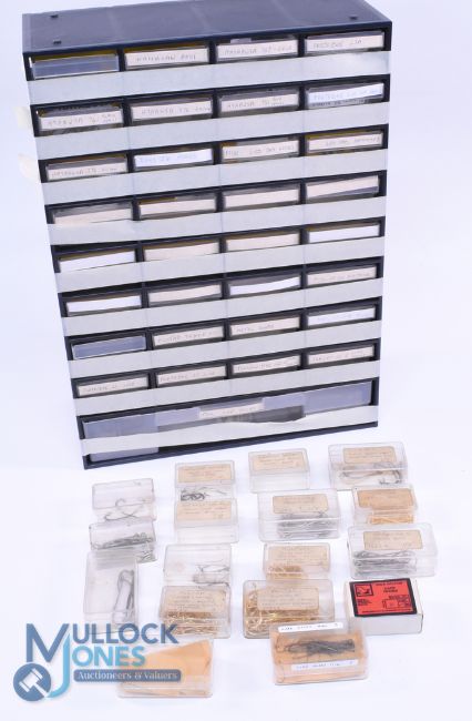 A huge collection of unused hooks by Mustad, Jack Hilton, Sundridge, Hamecons, Kamasan, Hayabusa, Partridge, Drennan and Fulling Mill - for course, sea and fly fishing. Housed in 32 drawer unit. See photo