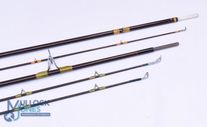 Hardy "Jet" fibatube trout fly rod 9ft 2pc, line 6#, alloy reel seat, agate butt ring, MCB. Hardy Fibalite spinning rod 7/8lbs, 7ft 2pc with spare tip, 15" handle, alloy uplocking reel seat, MCB. (2)