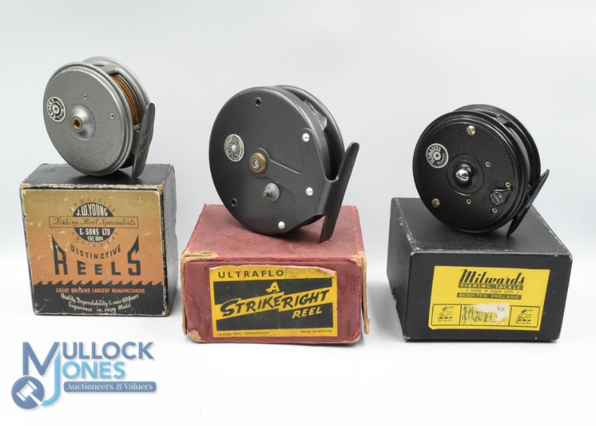 Strike Right Ultraflo alloy centre pin reel, 4 1/8" narrow ventilated spool, 2 screw latch, twin handles, on/off check, in original box and instructions, very light use; J W Young Comdex alloy trout fly reel, 3 1/4" spool, black handle, constant check, box and instructions, light use, runs well; Millwards Flymaster alloy trout fly reel, 3 1/2" ventilated spool, 2 screw latch, black handle, on/off check, original box, light use, runs well. (3)