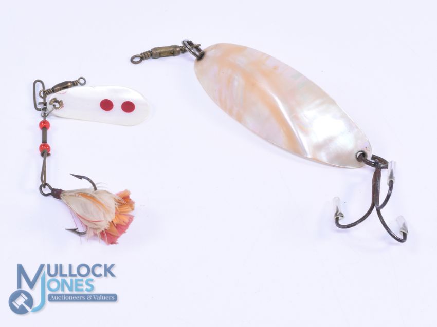 Vintage 4" Mother of Pearl spoon with front/rear split rings, box swivel and soldered treble, plus a 2" blade MOP spinner with red dots, red beads, and feather treble. (2)