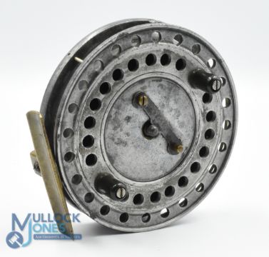 W F Homer "The Flick-Em" alloy centre pin/trotting reel, 4 1/8" narrow ventilated spool (note modification - exta 20 holes), lever latch, twin handles, on/off check, brass foot and line guide, spins well