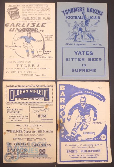 1950/51 Shrewsbury Town away match programmes v Carlisle Utd, Tranmere Rovers, Oldham Athletic, Barrow (heavy rust mark); fair. (4)