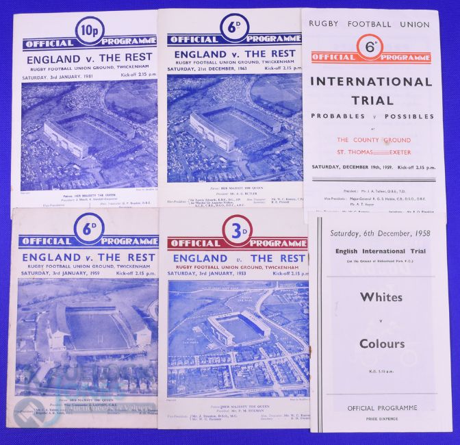 1950s England Rugby Trials Programmes (6): at Birkenhead Park, Dec 1958; at Exeter, Dec 1959; and at Twickenham, the January Trials of 1953, 1959 and 1981 and Dec 1963. Generally G/VG