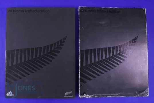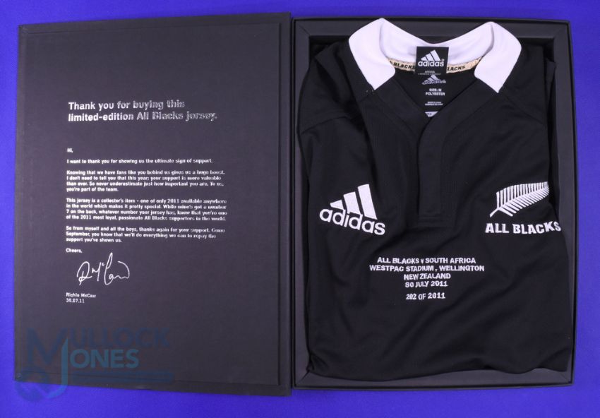 2011 Scarce All Blacks Limited Edition Boxed Jersey: Only 2011 of this edition were struck, ahead of the All Blacks' winning of their 'home' RWC. Adidas Jersey in mint condition in smart black customised box, with gilt message and facsimile signature of skipper Richie McCaw and number of the edition. Protective black cardboard outer sleeve, into which the fine box slides, shows signs of wear, otherwise VG. Splendid memorabilia of an historic NZ year
