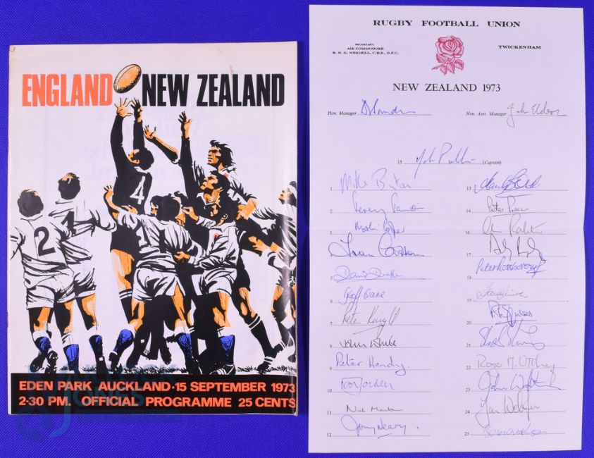 1973 Fully Autographed NZ v England Rugby Programme etc (2): All the players of both sides in this historic England win Down Under have signed, plus a near mint official England autograph sheet on Twickenham headed paper. A stunning pair, VG/Exc