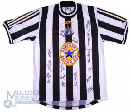 1997/98 Newcastle United Multi-Signed home football shirt in black and white, Adidas/Newcastle Brown Ale, 15x Signatures to the front in ink, features Alan Shearer, Steve Howey, etc - Shirt donated by the Club with Proceeds donated to the Derbyshire Fire & Rescue