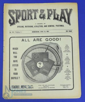 1904/1905 Sport & Play football journal covers Small Heath (reserves) v Shrewsbury Town (1st team) Birmingham League match programme also Aston Villa v Manchester City Div. 1 29 April 1905 at Villa Park plus WBA v Aston Villa veterans match; team line-ups stated, covers are loose, overall fair condition, no writing. (1)
