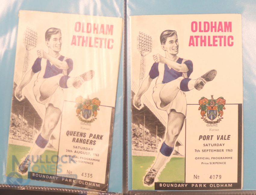 Collection of Oldham Athletic home programmes complete league season (Div. 3), plus Rochdale (Rose Bowl 17 August), St. Mirren (friendly 6 November), Mansfield Town (FAC 20 November), Bradford PA (FAC 7 December); fair/good. (1 Folder)