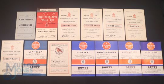 Selection of Cheltenham Town home programmes 1947/48 Merthyr Town, 1956/57 Hastings Utd, 1961/62 Cambridge Utd, 1960/61 Hereford Utd, 1962/63 King's Lynn, Dover, Corby Town, 1963/64 Llanelly (FAC), 1958/59 Nuneaton Boro, 1963/64 Yiewsley, 1964/65 Nuneaton Boro, Guildford City, 1966/67 Yeovil Town (FAC); fair/good. (13)