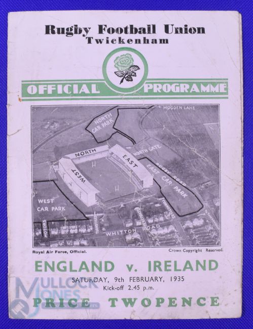 Scarce 1935 England v Ireland Rugby Programme: 14-3 English win, some creases and marks, edge nicks and somewhat rubbed but whole, strong and collectable standard Twickers 4pp card. Fair + for age