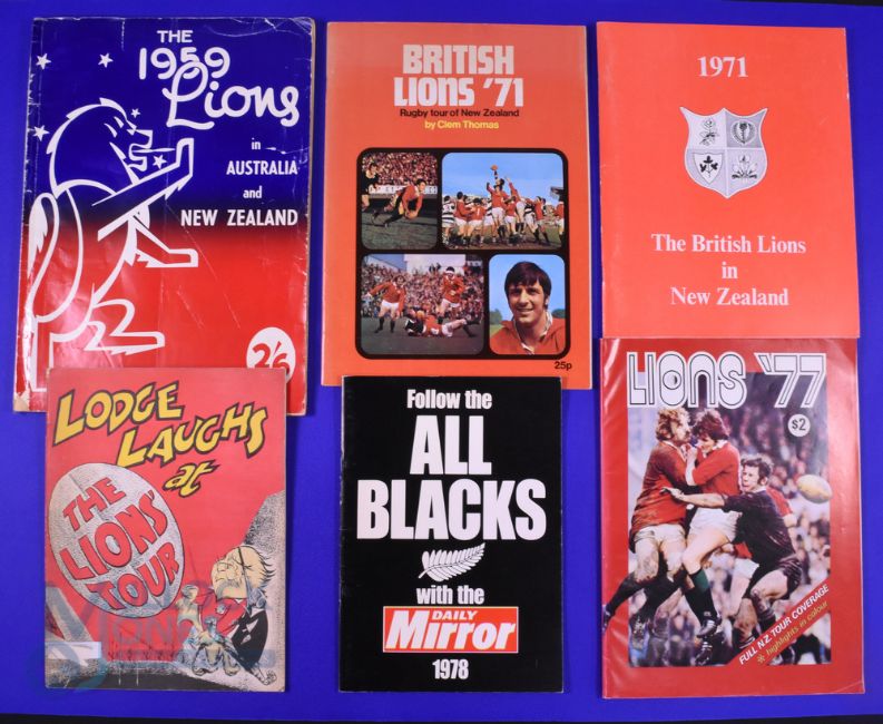 1959-78 Terrific Lions and NZ Rugby Tour Brochure Selection (6): The popular FW Boshier large 1959 Lions Review plus 'Lodge Laughs at the 59 Lions' cartoon s/back; 1971 Clem Thomas' and also the RU Writers' Club tribute brochures; full 1977 Lions review; and the Daily Mirror's The All Blacks' Tour in the UK, 1978. All G/VG