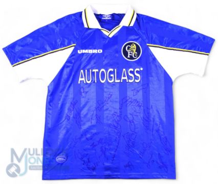 1997/98 Chelsea FC Multi-Signed home football shirt in blue Umbro/Autoglass, size XL, short sleeve, 25x Signatures to the front in ink, features Robert Di Matteo, Graham Le Saux, Nick Colgan, Tore Andre Flo, Mark Hughes etc - Shirt donated by the Club with Proceeds donated to the Derbyshire Fire & Rescue