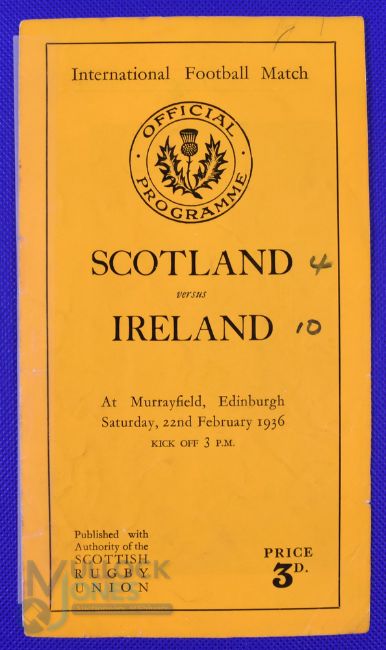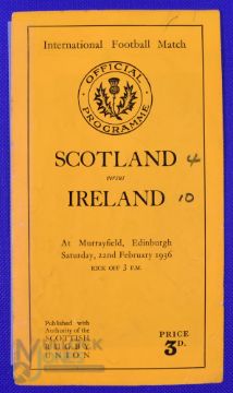 Scarce 1936 Scotland v Ireland Rugby Programme: 10-4 Irish win. Standard Murrayfield slim orange 8 pager. Neat spine tape, o/wise VG