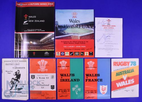 1957-2004 Wales etc Rugby Programmes, Mostly Signed (8): v International XV 1957 (6 autographs), President's XV 1970 (good prog, v doubtful signatures), Ireland 1971 (14 Welsh), France 1972 (film star Stanley Baker), Australia 1978 (1st test, 3 Welsh inc JPR) and 1996 (B John and M Lynagh), NZ 2004 (G Henry) and Hawke's Bay v Wairarapa, NZ, 1940 wartime. Interesting lot