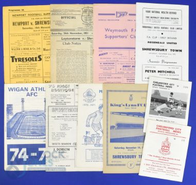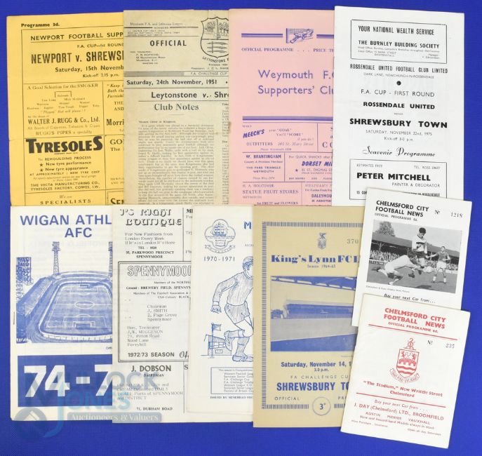 Shrewsbury Town away match programmes v non-league sides 1951/52 Leytonstone (FAC), 1956/57 Weymouth (FAC), 1958/59 Newport (I of W) (FAC), 1962/63 Chelmsford City (FAC), 1964/65 King's Lynn (FAC), 1966/67 Chelmsford City (friendly), 1970/71 Minehead (+ supplement), 1972/73 Spennymoor Utd (FAC), 1974/75 Wigan Athletic, 1975/76 Rossendale Utd (FAC); fair. (10)