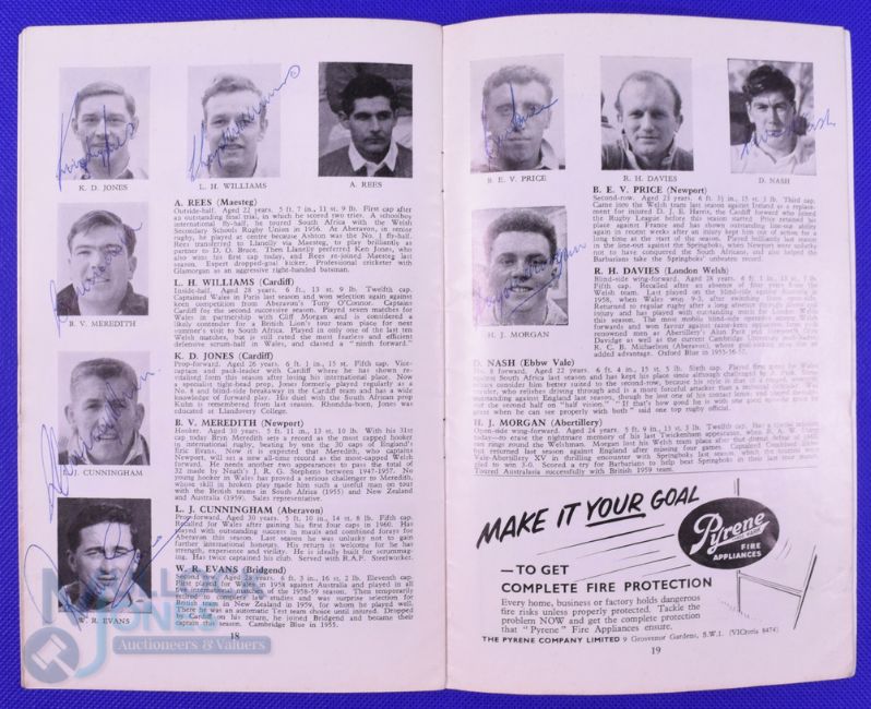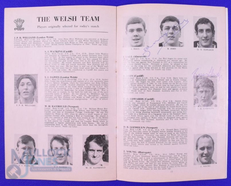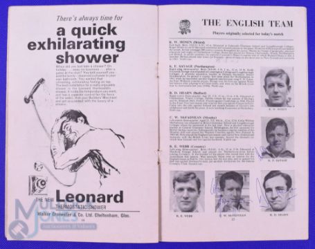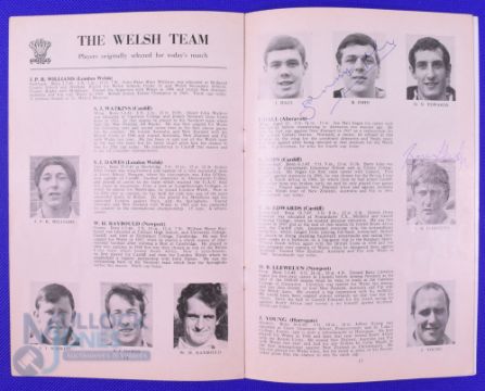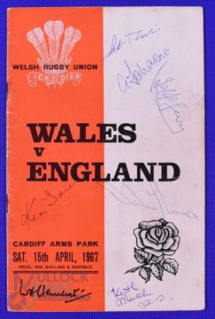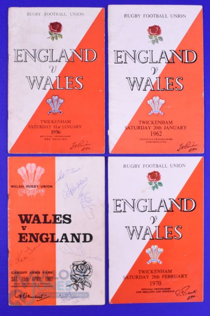 1956-1970 England and Wales Signed Rugby Programmes (4): All with some wear but generally G and with four Wales signatures (1956), nine (1962), 25 in 1967 (18 Wales inc star Keith Jarrett and 8 English) and Barry John and Barry Llewellyn on the 1970 issue. Nice lot