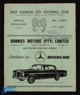 1966 East London City FC v Sir Stanley Matthews XI match programme 7 June 1966 in South Africa; 16 pages, has name written on front o/wise fair. NB Stan Matthews made several visits to SA, during this era, to carry out coaching and appearances duties
