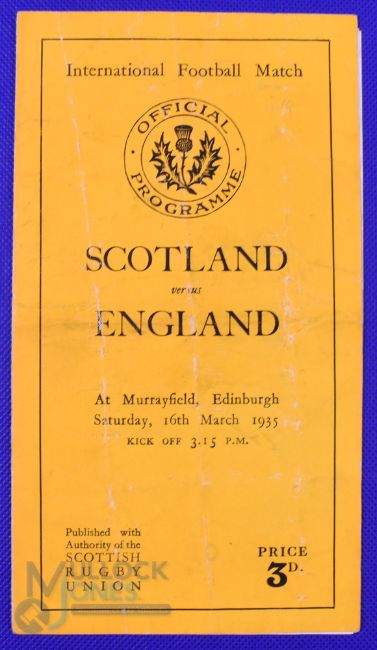 Scarce 1935 Scotland v England Rugby Programme: Standard Murrayfield slim orange 8pp issue, neat magic tape to spine, no staple, grubby to one team page: dropped on terraces?! O/wise adequate