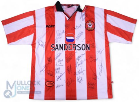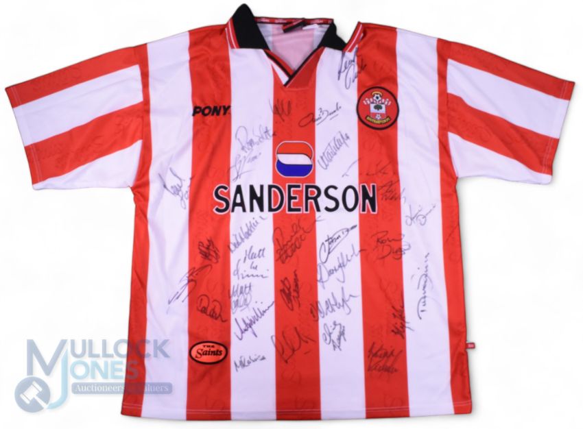 1997/98 Southampton FC Multi-Signed home football shirt in red and white, Pony/Sanderson, size XXL, short sleeve, 25+ signatures in ink to the front, features Matt Le Tissier, Robbie Slater, Neil Maddison, Matthew Robinson, Andy Williams, etc - Shirt donated by the Club with Proceeds donated to the Derbyshire Fire & Rescue
