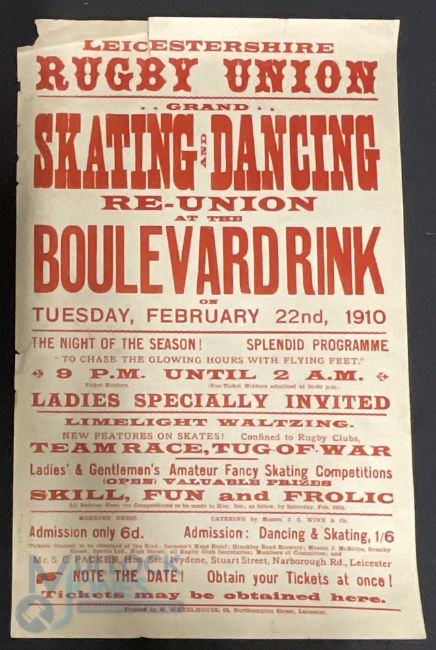 Original Posters Leicestershire Rugby Union Grand Popular Smoking Concert and Presentation of Trophies 23rd April 1904, 2nd May 1906 together with Grand Skating and dancing re-Union 22nd February 1910 - 45 x 28cm (3)