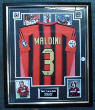 Maldini signed red and black AC Milan No.3 home replica jersey, short-sleeved, with LEGA Calcio Serie A and UEFA Champions League sleeve badges, reverse lettered MALDINI, signed in black marker pen, mounted surrounded by seven colour photographs of Paolo Maldini in action above a printed card PAOLO MALDINI, in a glazed frame, 98 by 83cm - originally purchased from G Budd auction 1921